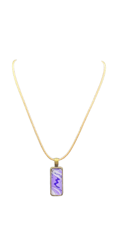 Elevate your style with this captivating purple abstract pendant necklace. Featuring a lustrous gold chain and a sleek rectangular pendant, this piece showcases a bold purple design artfully accented by touches of gold and cream, creating a luxurious and contemporary look. Perfect for adding a pop of color and elegance to both casual and formal outfits. The pendant measures approximately 1.5 inches by 0.5 inches, and the chain is adjustable from 16 to 18 inches, ensuring a comfortable fit. Each necklace is thoughtfully hand-made, making it a truly unique accessory and a perfect gift for art lovers and fashion enthusiasts.